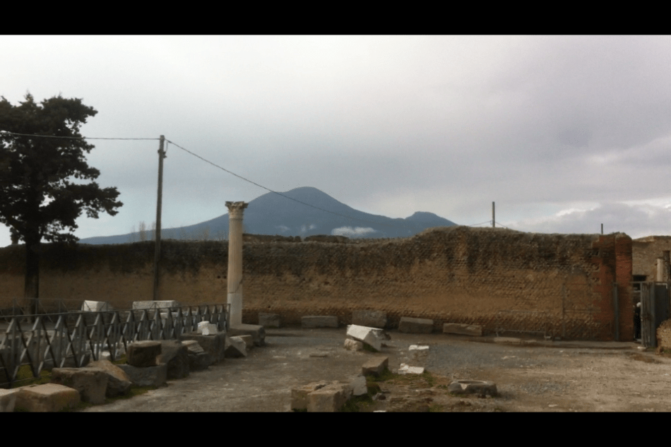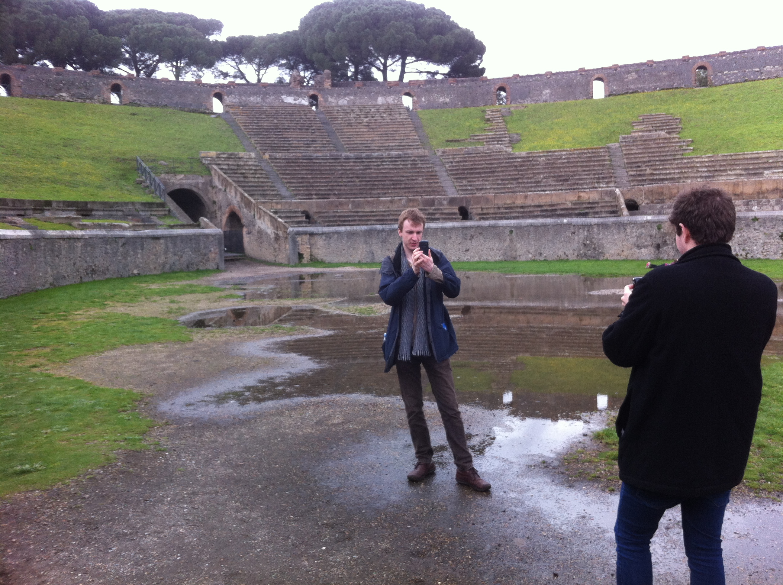 Pompeii was where I spent my first full day, exploring the huge ruins of a whole town. What was most astounding was the size of it – by the time I first presumed I was nearing the end of my wander from one corner to the other, I had barely seen a quarter. It is HUGE. It is a whole town. It goes on, and it makes incredibly clear the real amount of death that happened through scale. This WAS a town, with shops and leisure facilities and mansions and graves and terraces and a Forum for relaxing in, bath houses, theatre, amphitheatre… It was a whole town. A whole town where everyone died. The plaster casts of the dead were particularly shocking. (See my video “Pompeii: A Documentary” for more detail: http://youtu.be/jjCA1oOxml0) Death was everywhere there. The hours whizzed by. Here’s a picture of my friends photographing each other (but not me) in the Amphitheatre: