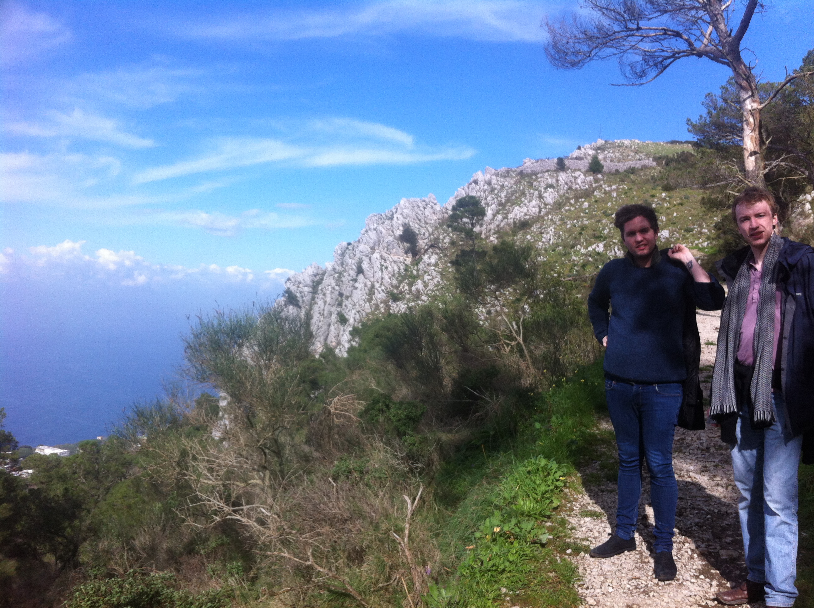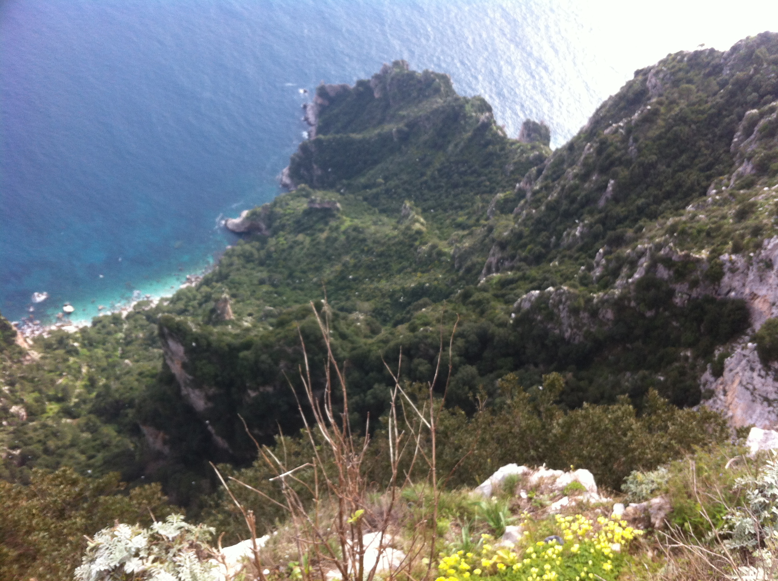 We sat and looked over the sea, back towards the mainland. We ate a small lunch from the only open cafe in town that cost a comically large amount of money. We wandered, looked into the church, looked up and around us. But the museums were closed, the funiculars and chair lifts about the island were closed… Yet the buses ran, the buses ran. So we moved to Anacapri, the other town, and climbed from it to the very peak of Mount Solaro, at a not unimpressive 589m. Quite a climb for men as unexercised as myself and those I was with. This from halfway up:
