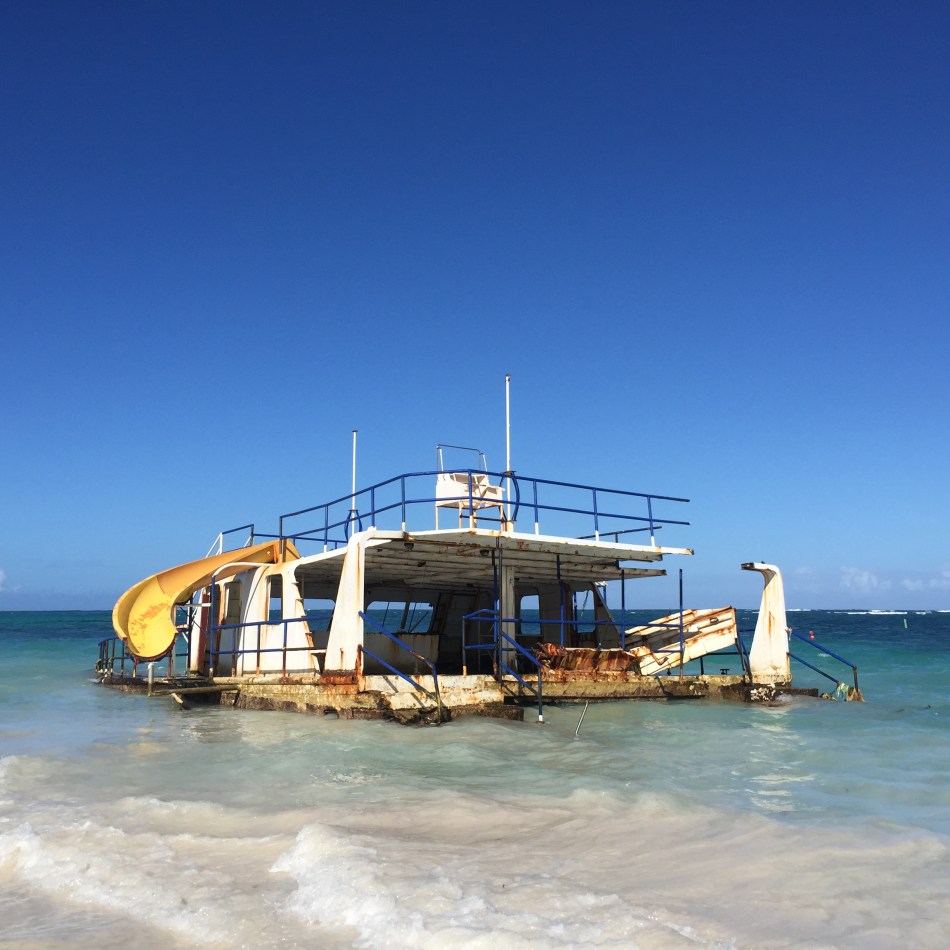 Then, the following day, we had almost as far to drive again, trying to get as close to the airport as we could to save driving today. Unfortunately, the airport we came into was at Punta Cana, the soulless tourist zone at the far eastern point of Hispaniola*. Of course, on arrival we immediately left for the capital, the barely spoiled West and then the mountains, but 18 hours in this fucking shithole has pushed me to a point of rage I am uncomfortable with. As opposed to the whole rest of the country, wifi is not free here. As opposed to the whole rest of the country, people who live here seem rude, aggressive and sales-focused. All the music is tawdry Western crap, none of the brilliant Dembow tracks every other bar and radio station in the country was playing, people here either speak at me in English or Spanish at a speed I am expected to (and cannot) understand. The beaches are dirtier, there are tourists everywhere, there is less wildlife, there are less Dominicans, there is less plantain and all the beer costs twice as much. About the only thing I did like here was this abandoned water park boat, beached like a harpooned whale, anachronistically on the beach.