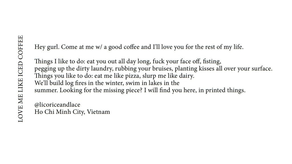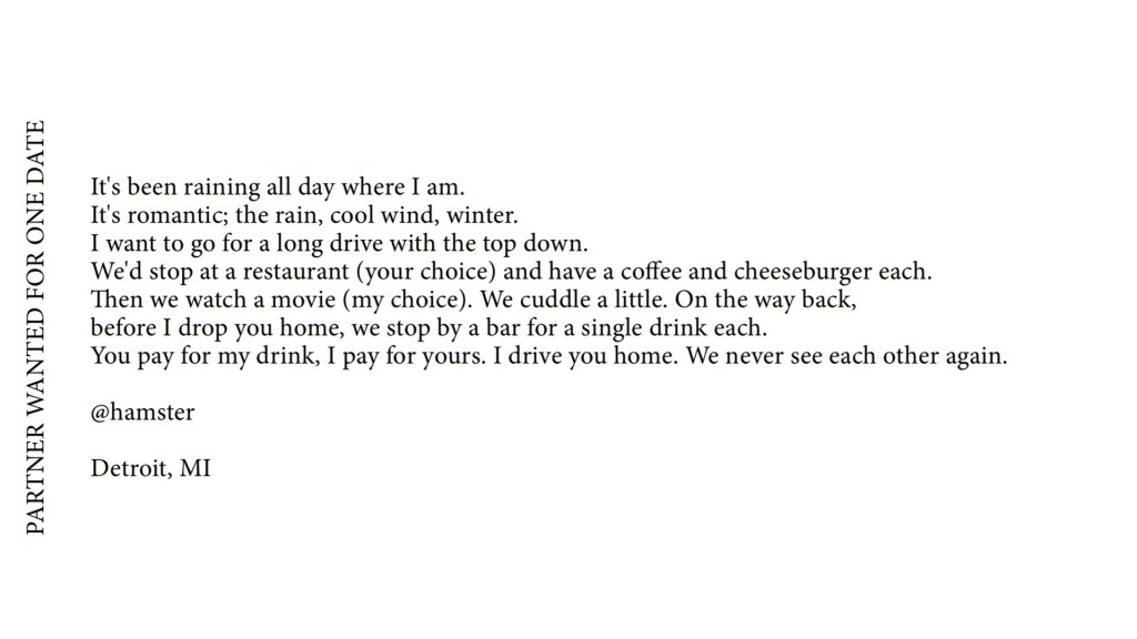 It sounds a bit high-school-stoner-intellectual to say “we are what we want” or “we are what we like”, but there’s an element of truth in that, especially in scenarios – such as the initial stages of seeking a romantic and/or sexual partner – when we’re being honest about what we want. We don’t usually get what we want if we don’t ask for it, right(?), and the book’s premise that it contains the words of many people proffering direct honesty makes for a rich source of poetry.