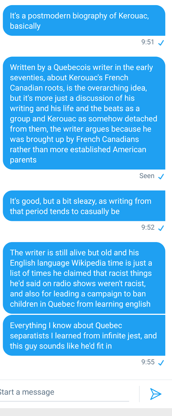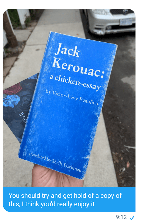 Anyway, halfway thru Jack Kerouac: a chicken essay I sent him the following DMs:
