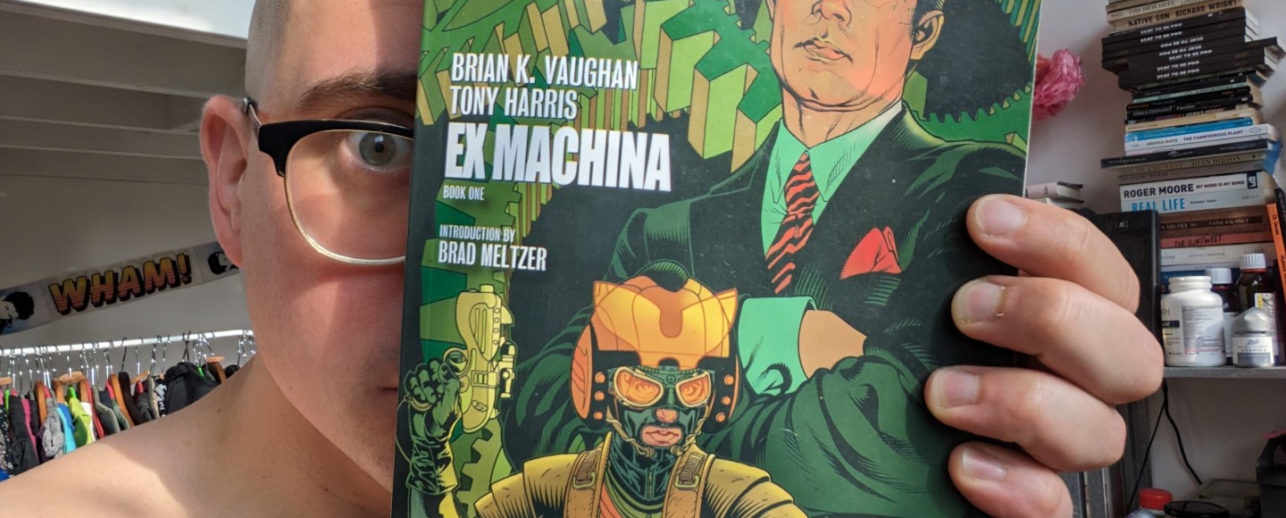 The Great Machine has/had a jetpack he had built in communication with its parts, so he could fly; he has a ray gun and possibly various other bespoke gadgets that will appear later in the flashbacks that I imagine continue to fill the issues of Ex Machina beyond the 11 included in this volume.
