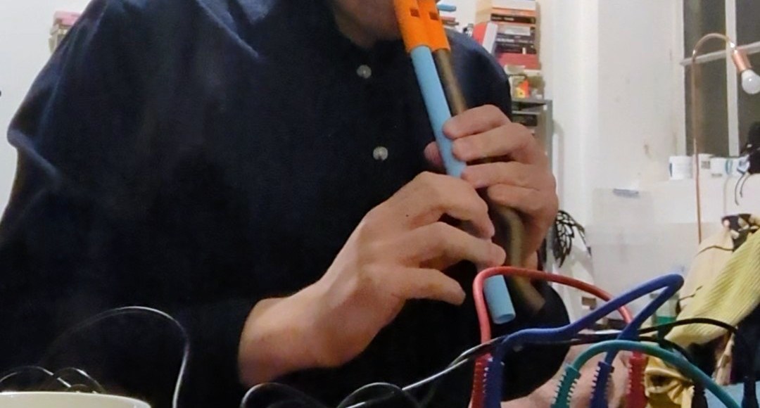 Using no input mixing board plus loop pedal, pitch shifter, distortion pedal, a weird plastic woodwind instrument I have, a drum machine and an under-used synthesiser.