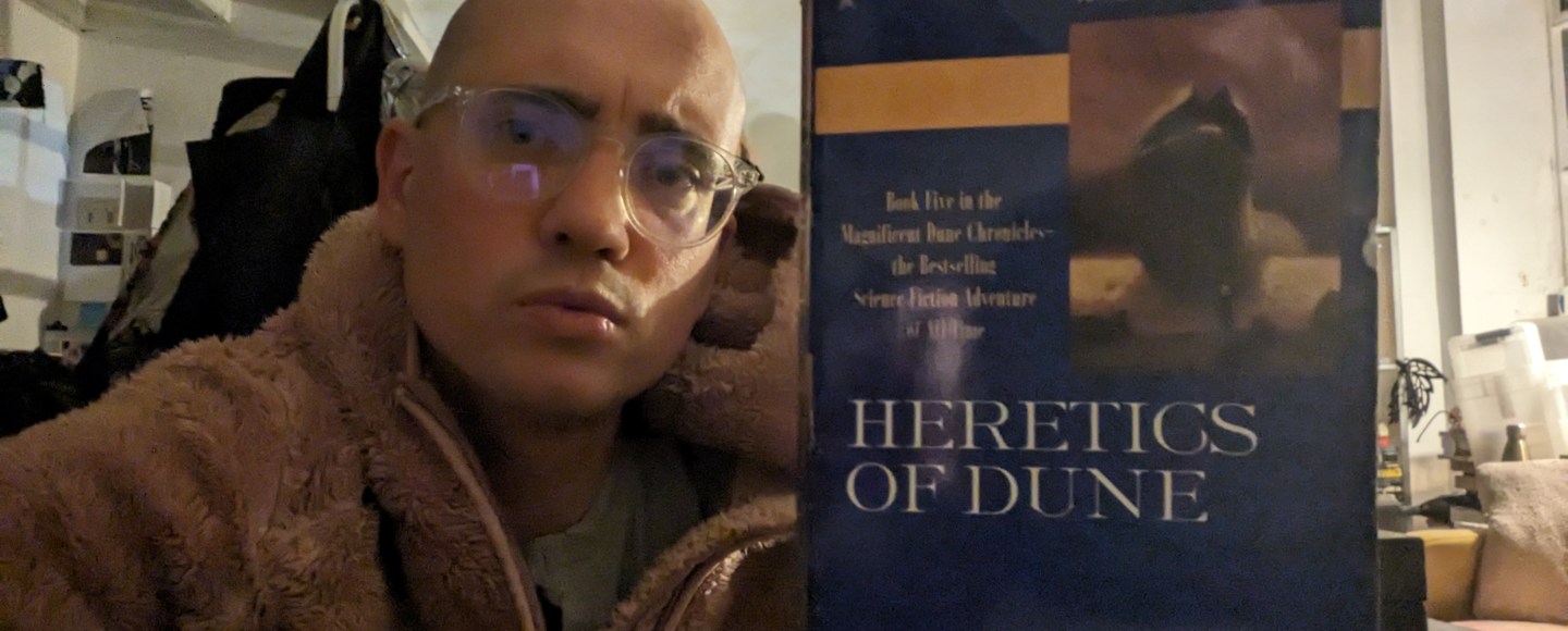 About a third of the way into reading Frank Herbert’s 198whatever science fiction tome Heretics of Dune, I said to my lover and to my dog (who were sat together on a sofa), “I don’t know if Dune 5 is one of the most pointless, self-indulgent pieces of crap I’ve ever read, or if this is one of the greatest genre texts ever put to paper.”