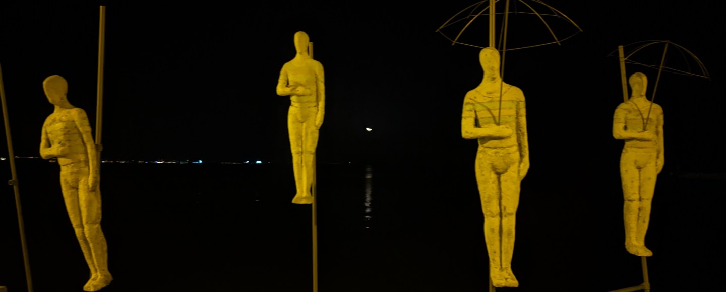 I passed a large lagoon where flamingoes can sometimes be seen. I walked past buildings of a variety of architectural styles. I saw many, many, cats, some sculpture, the dark Mediterranean and some traffic, meandering through the city at night.