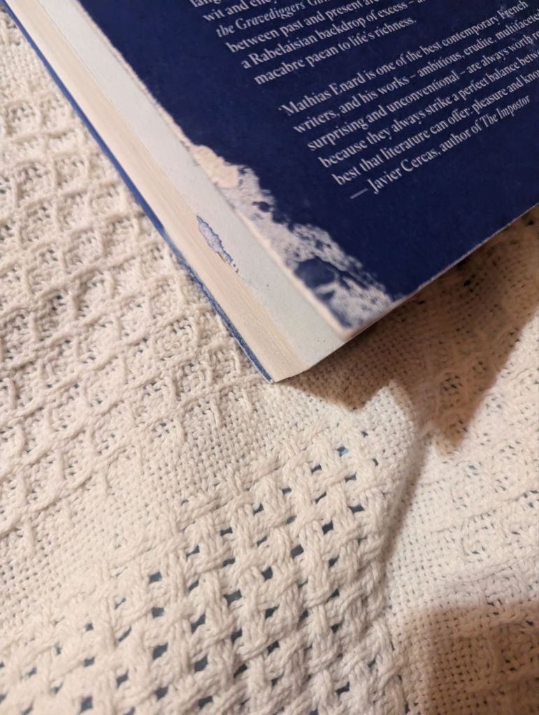 Obviously, I was going to love it, I’ve loved all of the other Enard novels I’ve read [in translation] over the past few years, and it was only the terror of finding this one too complex with my mushy baby-incoming and then new parent brain that led me to put off reading it for so long that I’ve somehow damaged my copy of the book in a way that I don’t really understand…