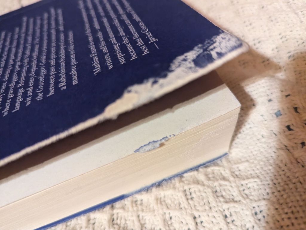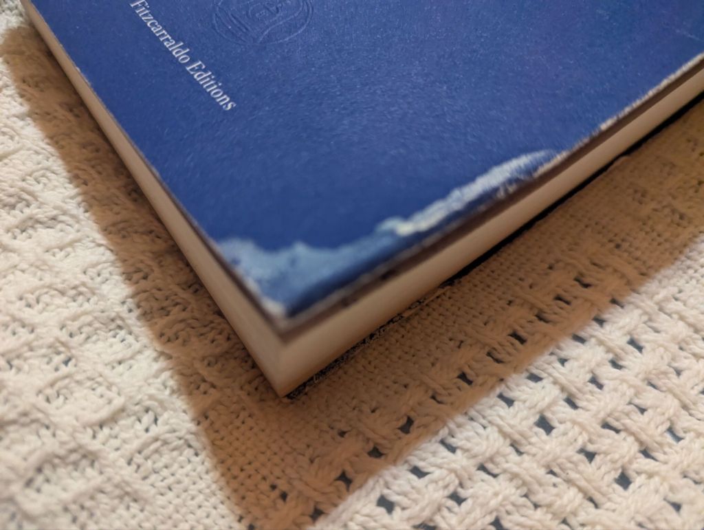There is crunchy, crumbly, pure white crystallised material in the bottom corner, sticking pages and the cover together. I think, possibly – and this is a guess because I’m in Canada at the moment and live with a Canadian in London – it was maybe dipped/dropped in some maple syrup??? Possibly it was wetted by salt water at some point? Certainly the damaged corner of the volume in my hand bears evidence of both previous dampness and some kind of no-longer-present solution. There’s no stickiness, though I’m sure that, were I to re-add water to the now dry and slightly misshapen French flaps, some stickiness could return, but it’s not something I’m willing to test as I don’t want this book to be damaged any further. It also didn’t cause any damage more than a maximum of 5mm in from the edge of the page, which is thankfully much less than the margins used by Fitzcarraldo, so my readerly enjoyment of the text faced no impact at all.